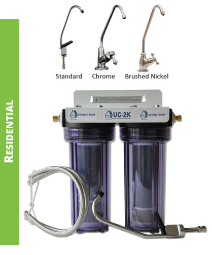 The UC-2K water filtration system includes standard 3rd faucet, connections required for installation, a wide spectrum & specialty cartridges of your choice. The UC-2K dual cartridge system utilizes our wide-spectrum cartridges (KR-101N, KR-101A or CR-1) in tandem with a specialty cartridge designed to target a specific contaminant of concern.